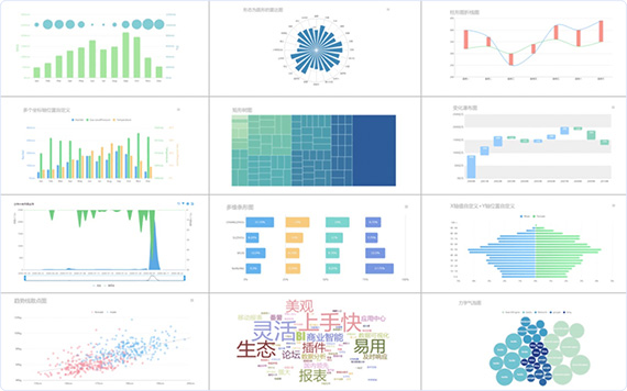 - 數(shù)十種的可視化圖表效果,包括柱形圖、折線圖、雷達圖、散點圖和詞云圖等,滿足不同人群的閱讀偏好,為您展示多樣數(shù)據(jù)信息提供全面支持